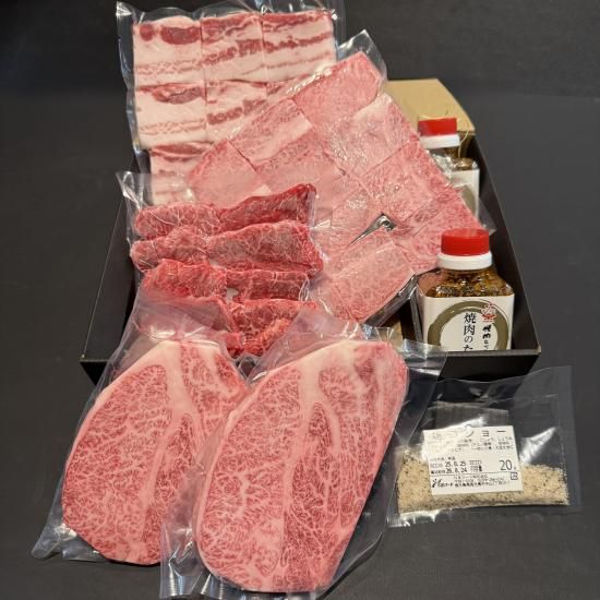 黒毛和牛・黒豚セット(焼肉用霜降り200g・赤身200g・黒豚バラ300g、ロースステーキ200g×2枚、焼肉のたれ2本・塩コショウ付)