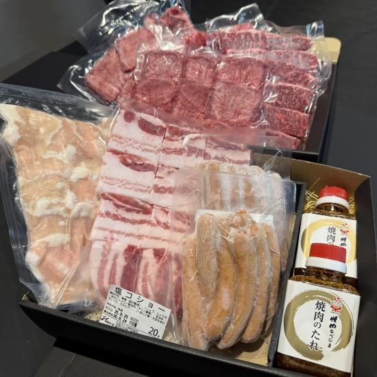 バーベキュー用バラエティセット【大人数向け】(黒豚300g・ウインナー500g・シマチョウ500g)(カルビ500g・ハラミ400g・牛タン300g・焼肉のたれ2本・塩コショウ付)