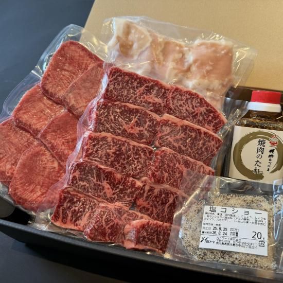 お手軽焼肉三種盛りセット【3人前】(ハラミ300g・牛タン300g・シマチョウ300g・焼肉のたれ2本・塩コショウ付)